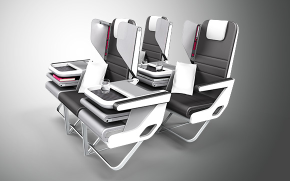 In its economy configuration, Checkerboard functions just like a typical modern coach class seat designed for short haul flights, with seatback mounted table, high back literature pocket that maximizes legroom, and a high pivot recline that reduces intrusion into living space of the passenger behind.